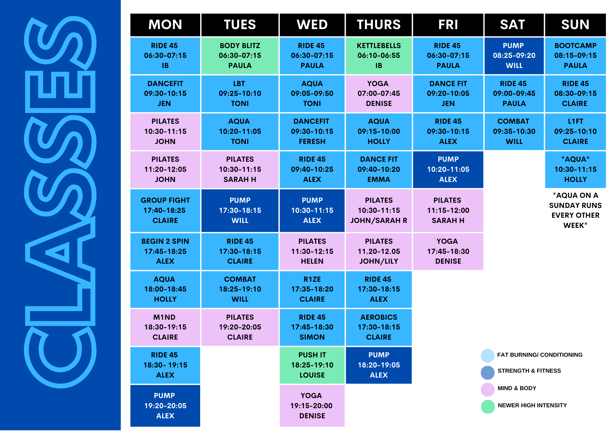 You can view our schedule of classes by clicking the image below. If you have any queries about our classes or to book on to a class, please contact reception who will be happy to help.